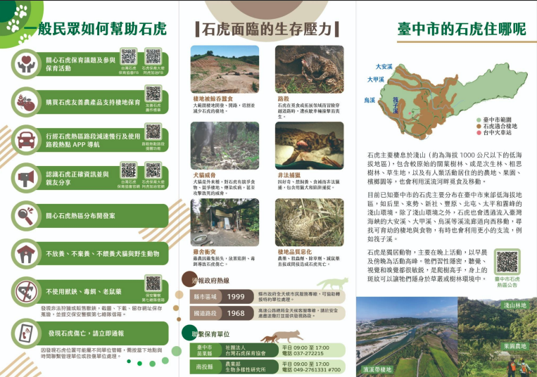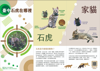 臺中石虎在哪裡-1 為提升市民對石虎保育議題之認識,並宣導石虎棲地保育與友善環境觀念,臺中市政府農業局製作「臺中石虎在哪裡」宣導手冊及摺頁電子檔,內容包含石虎生態特性、本市石虎分布情形、面臨之生存威脅及民眾可共同參與之保育行動等資訊,推廣石虎保育觀念。